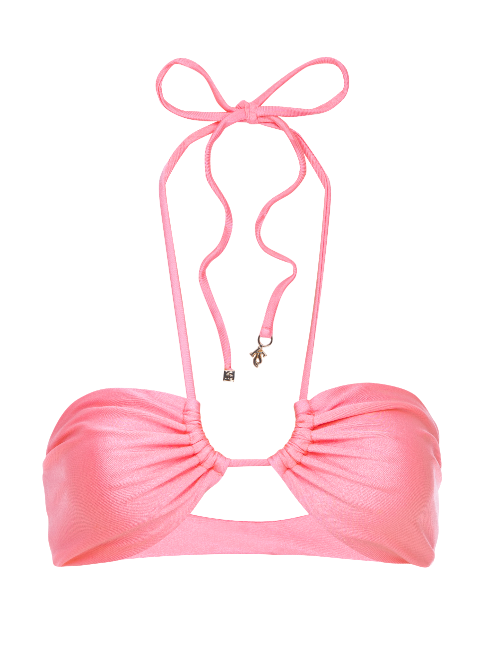 The Tessa Bandeau Top in Abalone hugs you in all of the right places to define your curves. The refreshing swirls of blues, mint and white, like the reflection of an abalone shell, will captivate everyone. And what better way to further define your curves than with a matching adjustable drawstring that lets you control the cup ruching and determine straight or front-crossed halter tie-back style. Kamari signature gold hardware adorns the ties.