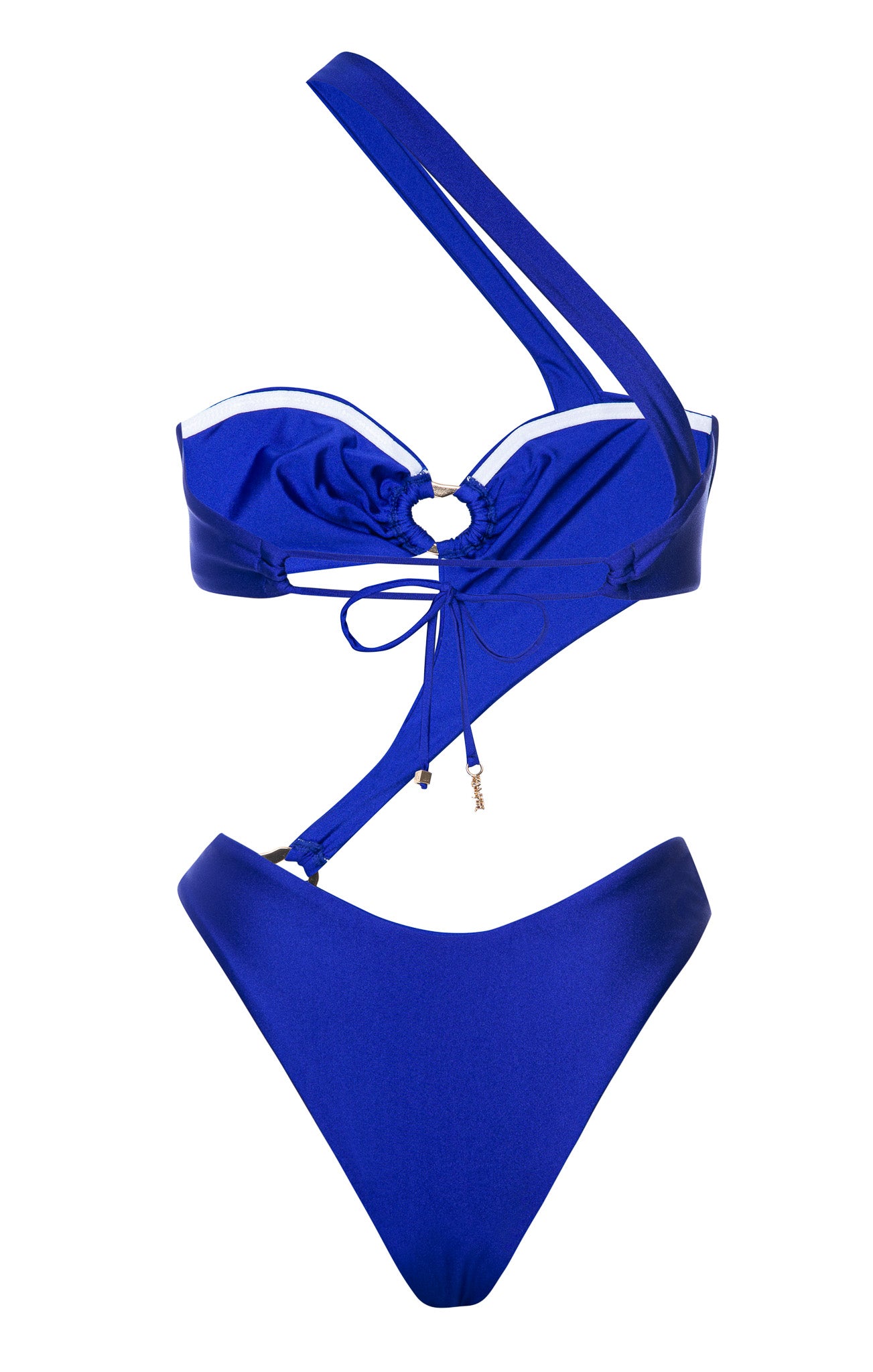 The Madi Asymmetrical One Piece in Indy is a work of wearable art. Indy’s richly hued blue evokes calming deep sea waters. Madi combines the best of a cheeky bottom and bandeau top with exceptional asymmetrical styling. Artistic oval gold rings at each hip and in the center of the bandeau take Madi to the next level, while Kamari’s signature gold hardware completes the ties with style.