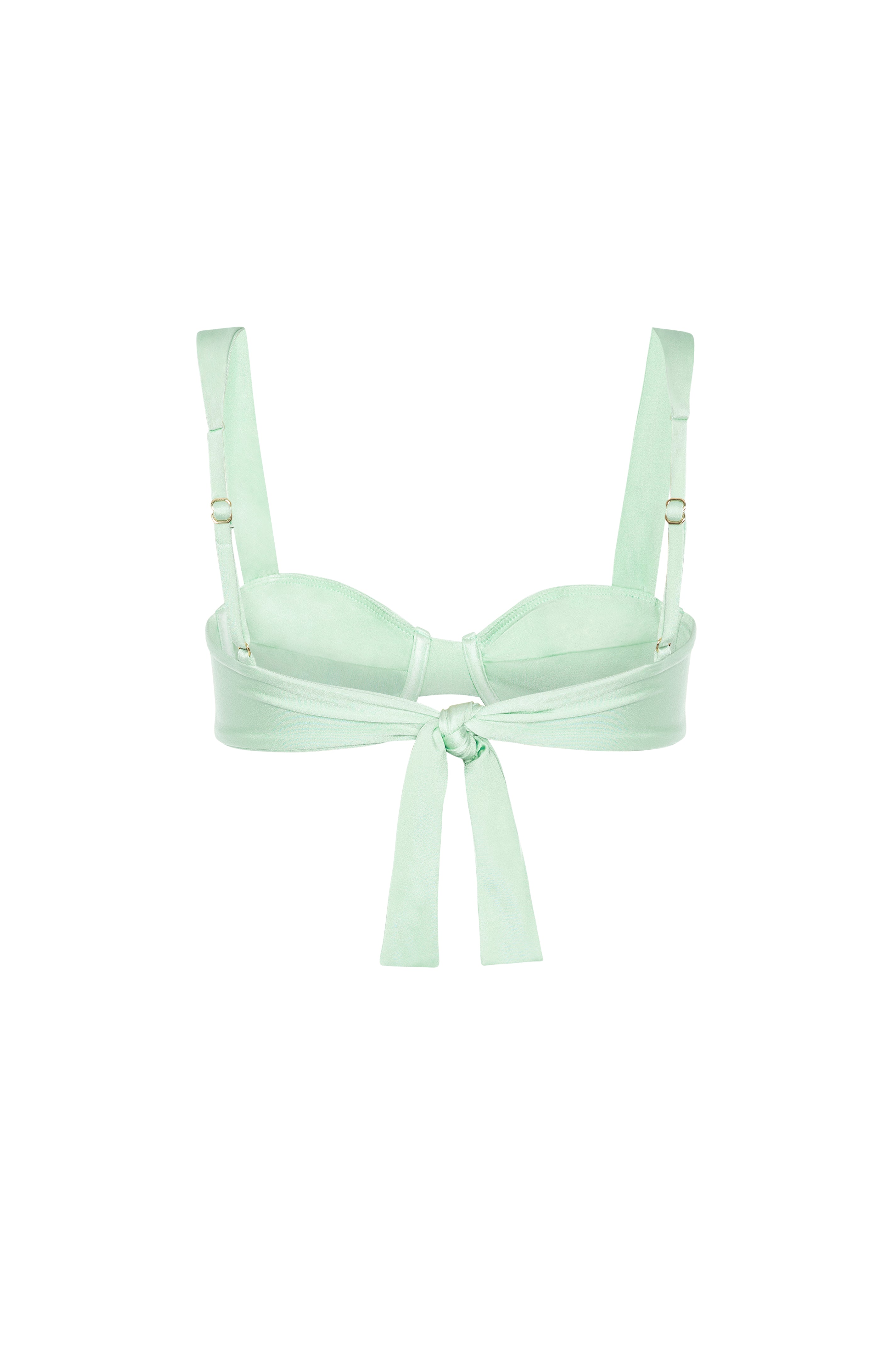 Make a splash in the Bambi Underwire Bikini Top in Mint—a fresh take on a classic shape. With structured cups, subtle ruching, and wide adjustable straps, this mint green bikini top offers both lift and comfort. The cool pastel tone pops against sun-kissed skin, making it the ultimate swim top for your next vacation.