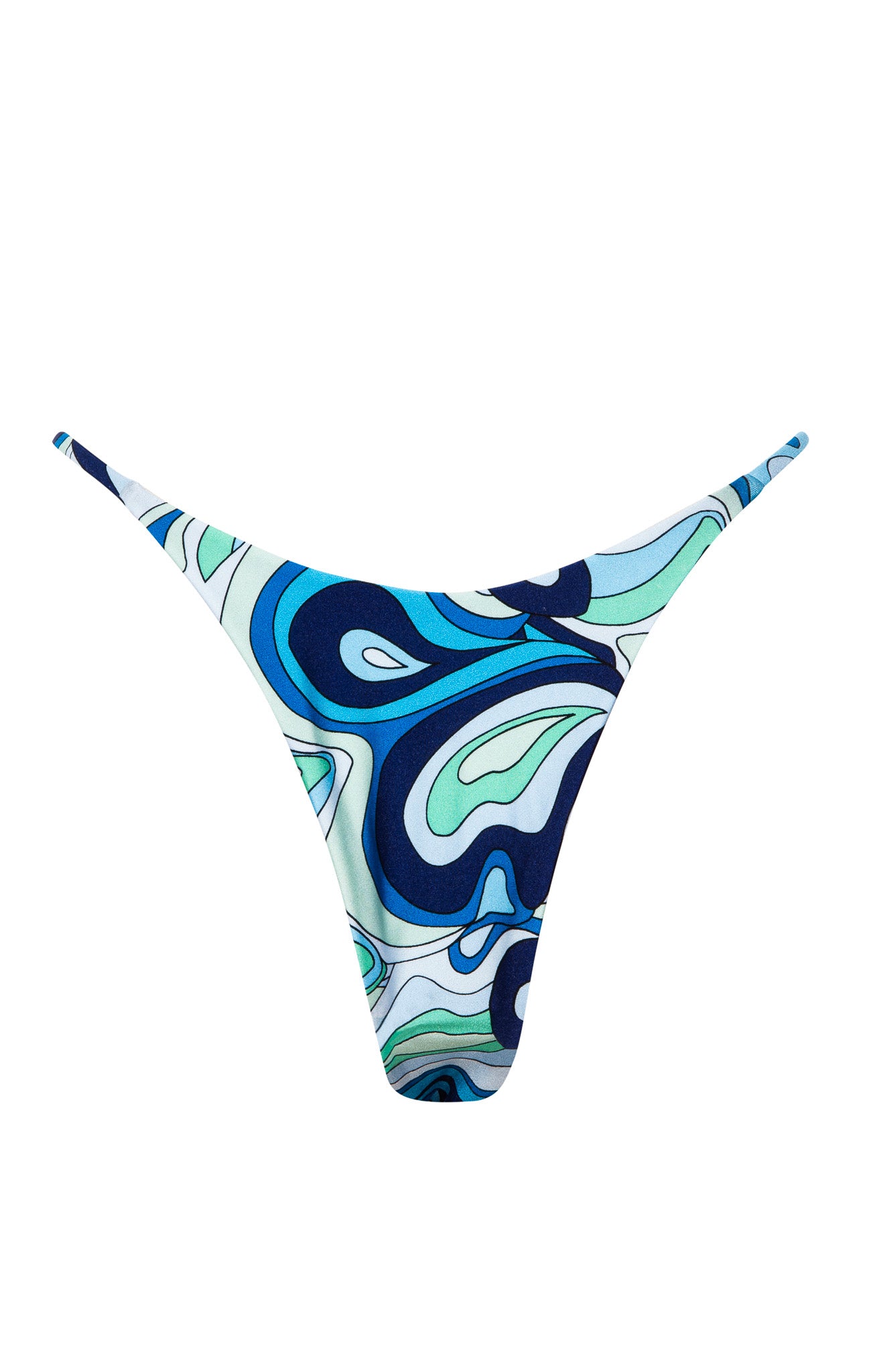 The Cami Minimal Bottoms in Abalone are an alluring bikini bottom with a deeply vee’d shape. The refreshing swirls of blues, mint and white, like the reflection of an abalone shell, will captivate everyone. Small gold rings on the front of the thin side straps are like little jewels highlighting this dare-to-bare piece that will turn heads.
