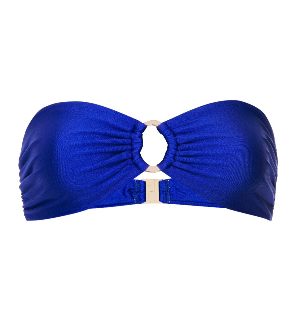 The Elsa Strapless Bandeau Top in Bubblegum truly shines with a dazzling oval gold ring that shapes the center ruching and a jewelry-like gold clasp in the back. The brightly hued pink is a youthful spirited color that calls for fun. The comfortable silicone strip inside the top of each cup keeps you comfortably covered and free to swim and sashay with ease.