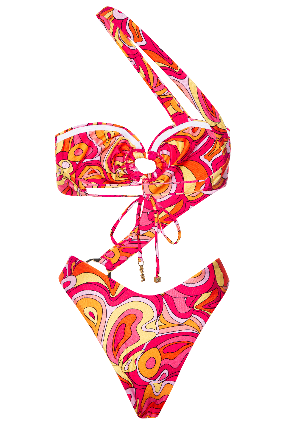 The Madi Asymmetrical One Piece in Calico is a work of wearable art.Hot tropical colors of pinks, mango, and yellow turn up the sizzle factor. Madi combines the best of a cheeky bottom and bandeau top with exceptional asymmetrical styling. Artistic oval gold rings at each hip and in the center of the bandeau take Madi to the next level, while Kamari’s signature gold hardware completes the ties with style.