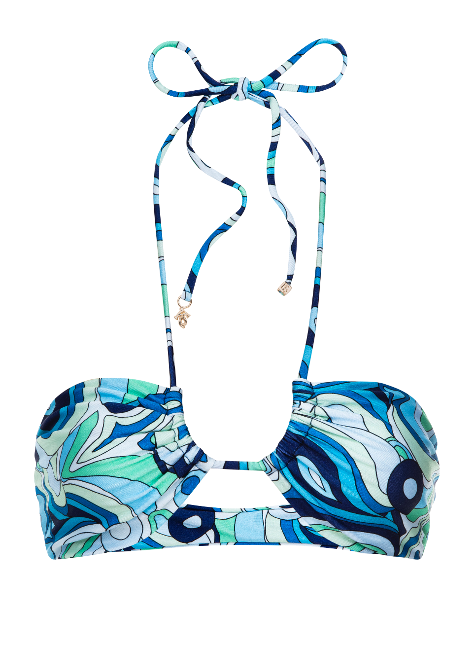 The Tessa Bandeau Top in Abalone hugs you in all of the right places to define your curves. The refreshing swirls of blues, mint and white, like the reflection of an abalone shell, will captivate everyone. And what better way to further define your curves than with a matching adjustable drawstring that lets you control the cup ruching and determine straight or front-crossed halter tie-back style. Kamari signature gold hardware adorns the ties.