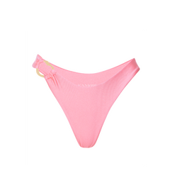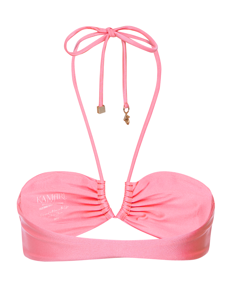 The Tessa Bandeau Top in Bubblegum hugs you in all of the right places to define your curves. The brightly hued pink is a youthful spirited color that calls for fun. And what better way to further define your curves than with a matching adjustable drawstring that lets you control the cup ruching and determine straight or front-crossed halter tie-back style. Kamari signature gold hardware adorns the ties.