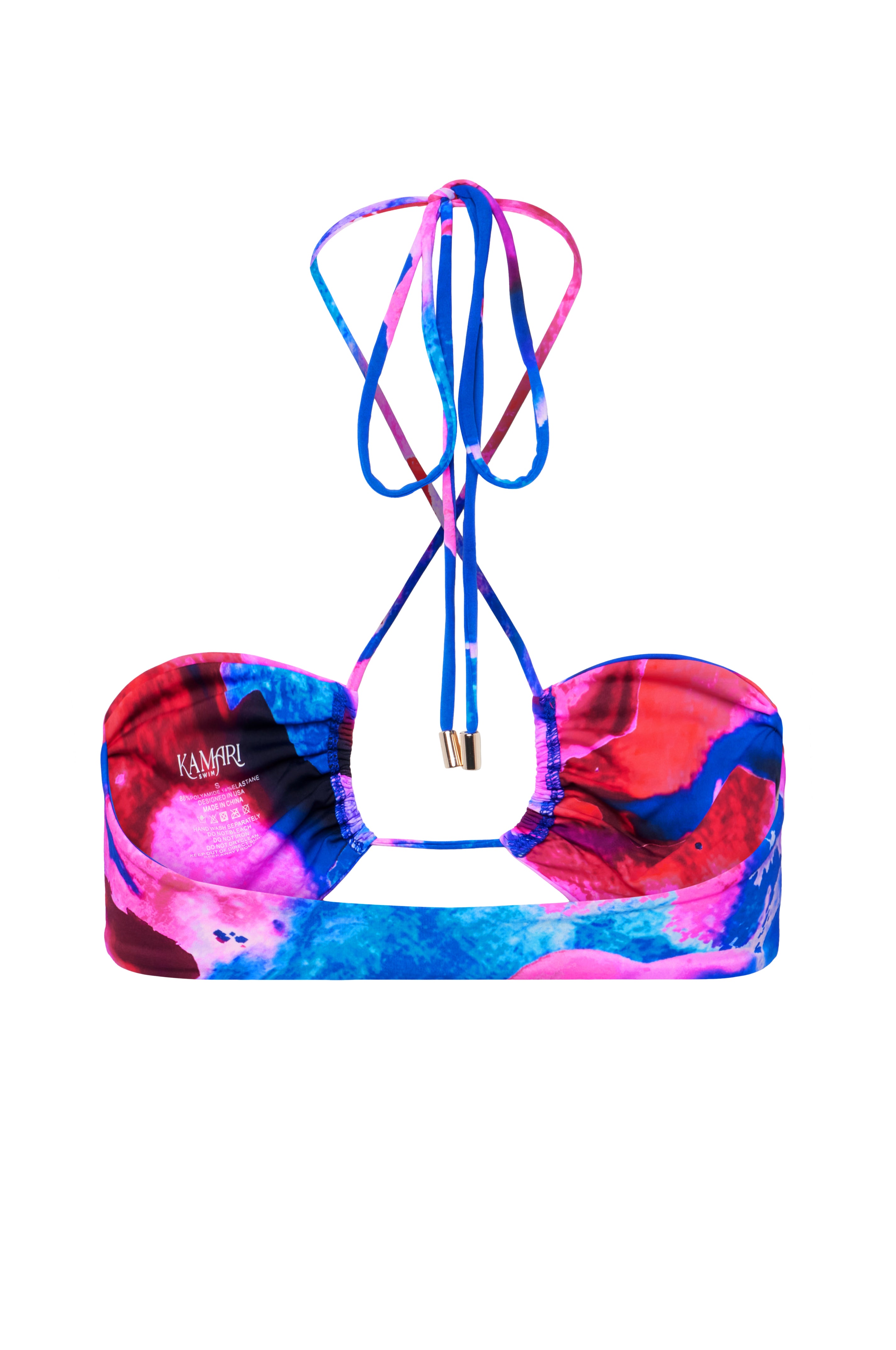 With adjustable front straps, the sexy Bandeau Bikini Top can be styled in multiple ways. The bright pink and blue print stands out at the beach, poolside, or whatever the day calls for. Pairs well with the matching Cheeky Bikini Bottoms.